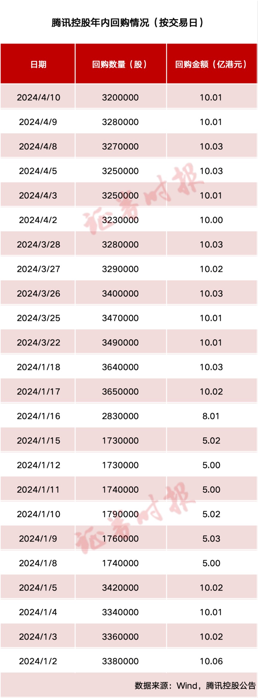 此前宣布将今年回购规模至少翻倍的腾讯控股,日前正有条不紊地进行股份回购。记者根据最新披露的数据统计发现,在经过4月10日的回购后,腾讯控股年内累计回购金额首次超过了200亿港元。